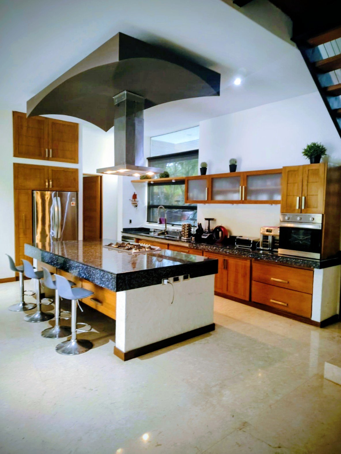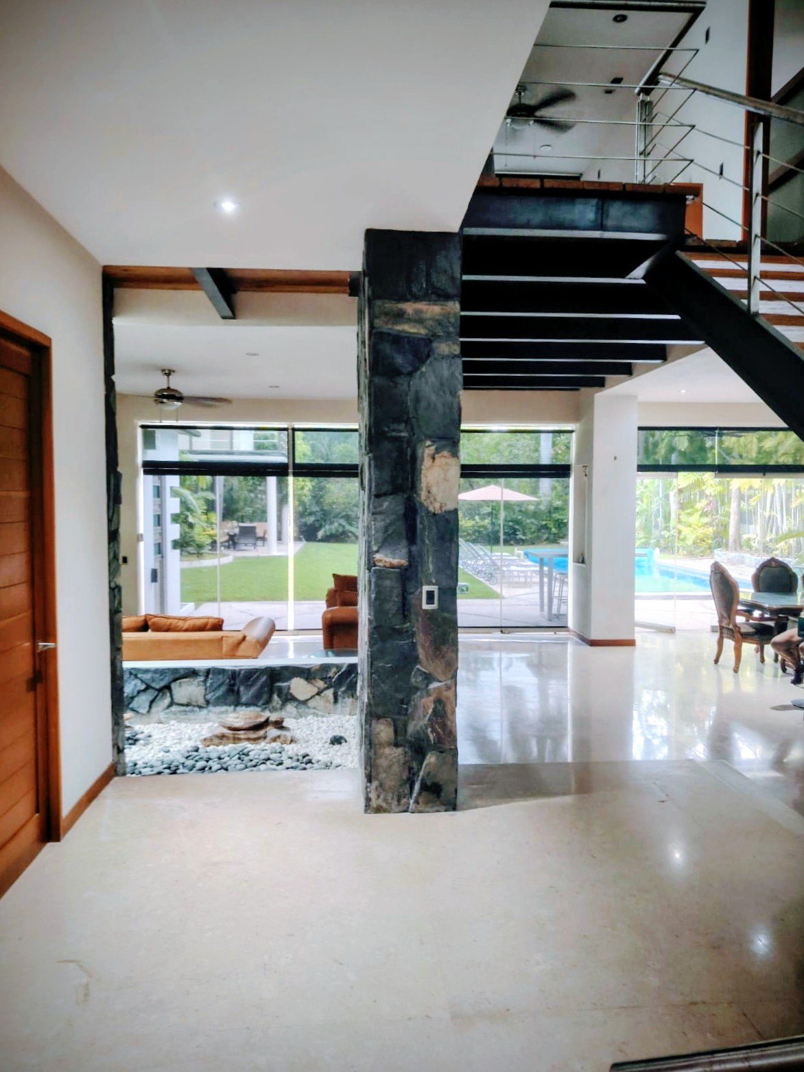 En planta baja se encuentra 1 recamara, 1 baño completo, Cocina integral (totalmente equipada), 1 cuarto de Lavado (lavadora y secadora), 1 cuarto de Servicio (con baño completo), Comedor (con mesa y 8 sillas estilo colonial español) y Living. El Living cuenta con una cascada con Fuente de muro llorón, lo que da una sensación de bienestar y tranquilidad al ambiente. La sala principal tiene doble altura lo que favorece la ventilación e iluminación y cuenta con 2 a/a y 2 ventiladores.