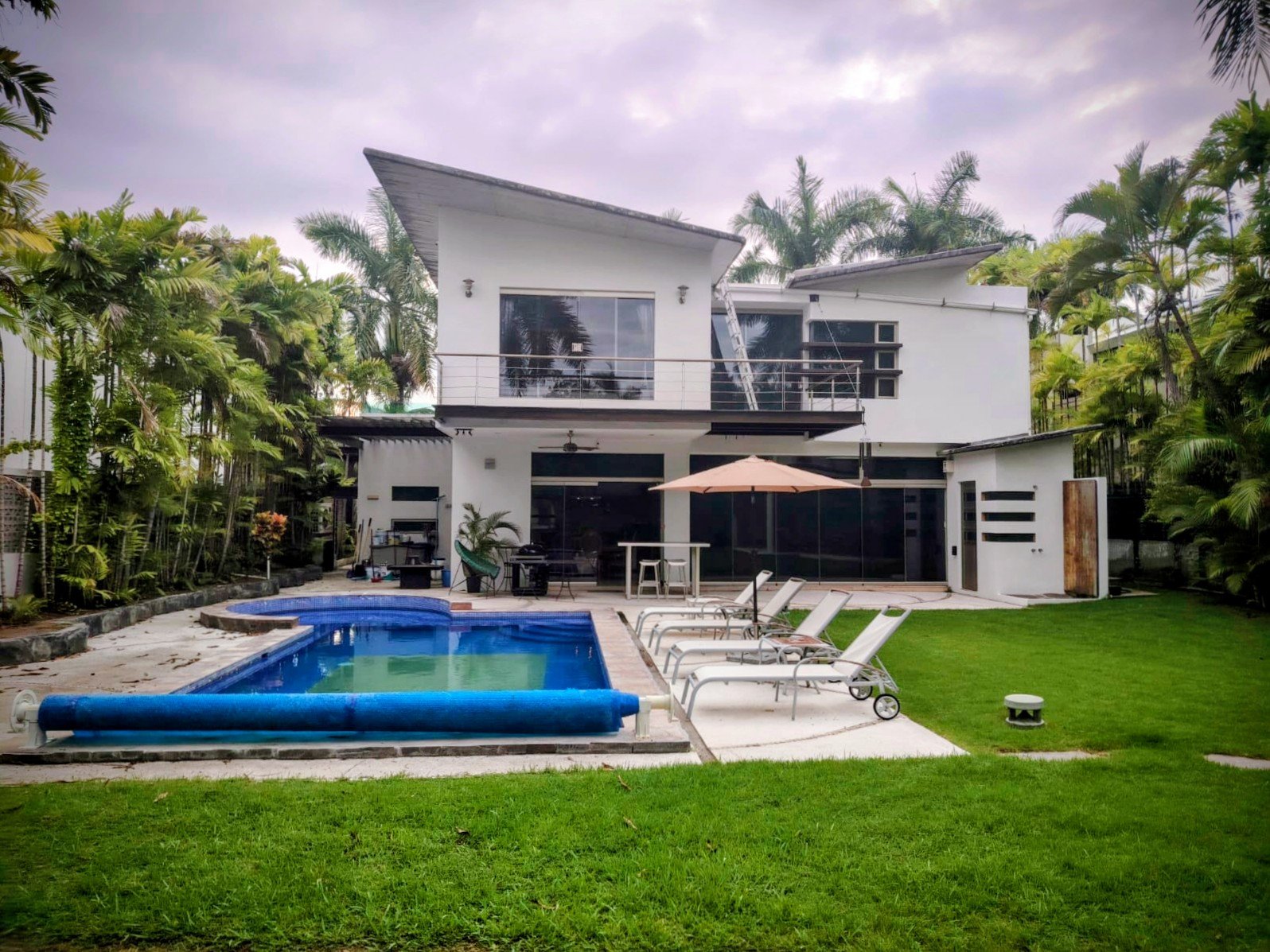 El jardín tiene una superficie de 330 mts2 aprox. y cuenta con alberca, asador, living de jardín, casa de niños, un medio baño y muelle con salida a la marina de Nuevo Vallarta.